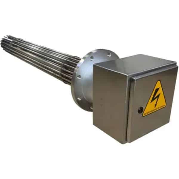 El calor se distribuye de forma homogénea a través de múltiples elementos tubulares, envolviendo el fluido con una energía térmica constante y estable. La robustez del flange metálico transmite una sensación de solidez industrial, mientras que el acabado técnico refleja precisión, seguridad y confiabilidad operativa.