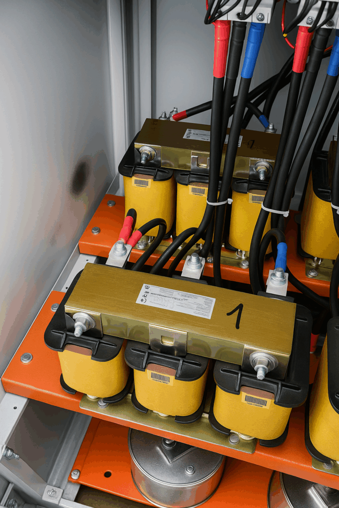 Cada etapa cuenta con reactancias sintonizadas al 7 % (189 Hz), diseñadas para proteger los condensadores y bloquear armónicos de baja frecuencia.